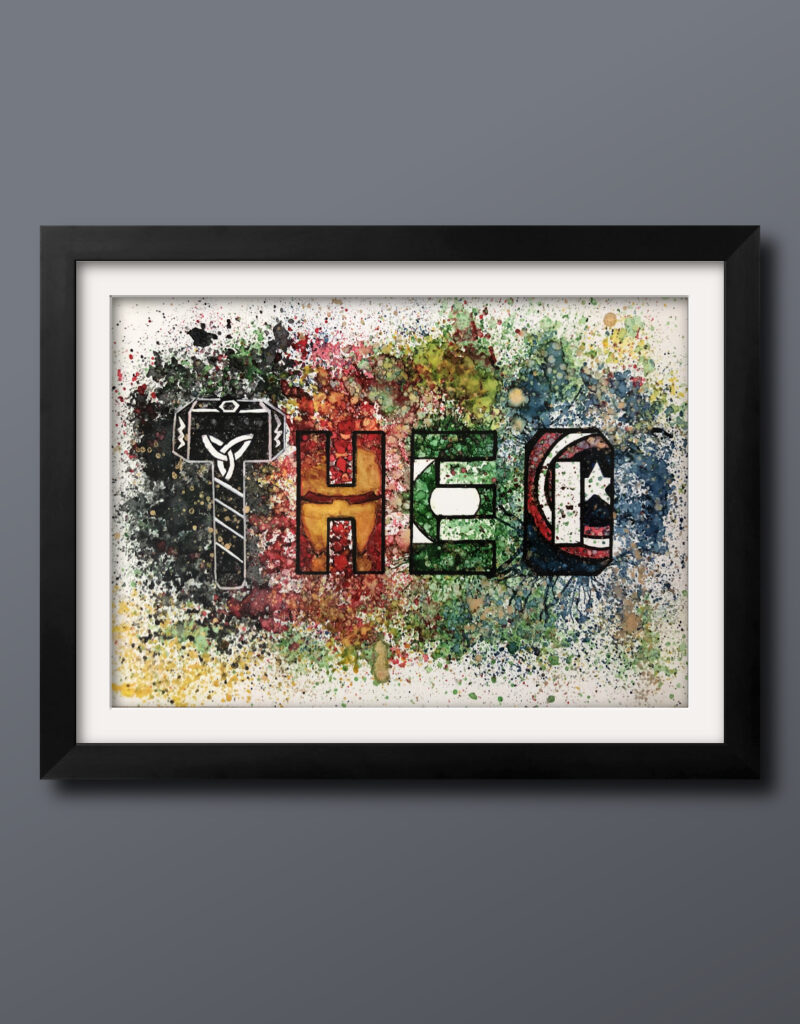 Custom Order – 05/21 – Theo Unique Marvel inspired name art in Alcohol Ink. Alcohol Ink and Posca Pen on Yupo paper with Gold metallic paint. This piece of original artwork was commissioned.